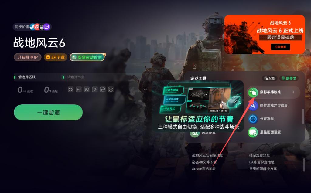 对于刚接触战地6的玩家,如果觉得开镜对枪手感不佳,可以点击奇游加速工具的鼠标手感校准选项。