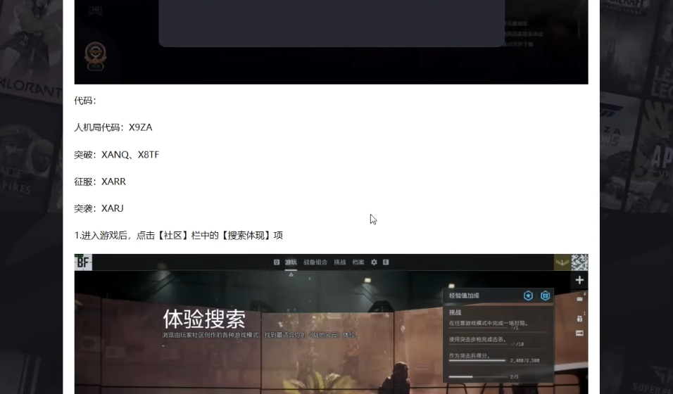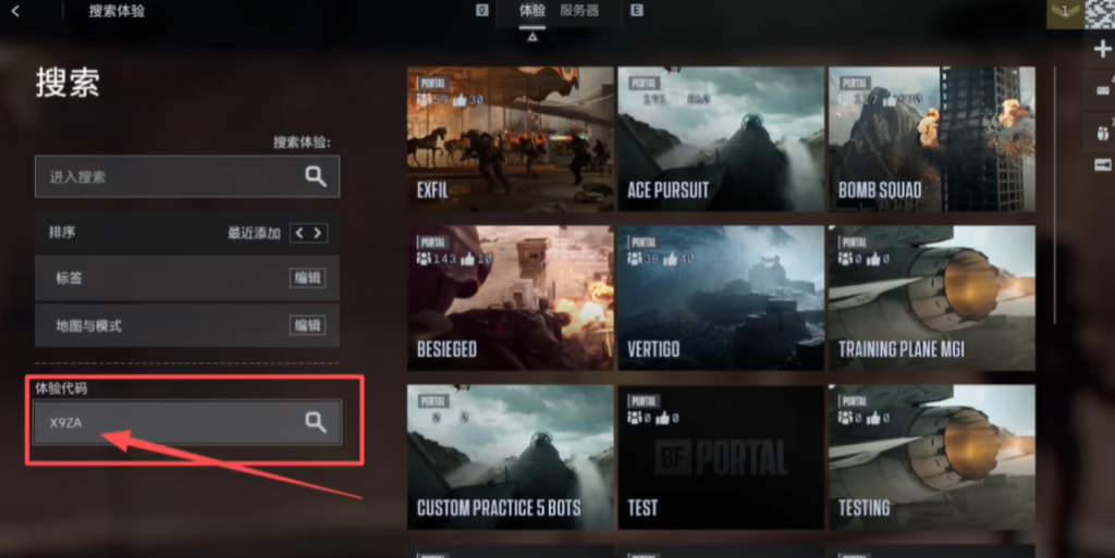 获取到人机局突破征服突袭模式的所有代码后,就可以进入游戏了。在游戏主界面,找到并点击社区栏中的“搜索体验”选项。
