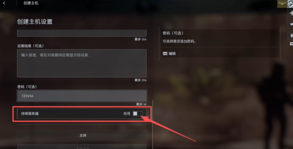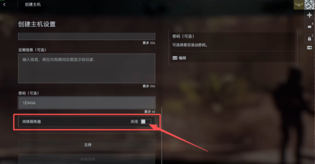 在设置过程中要注意将持续服务器选项选择为关闭状态,关系到后续能否顺利进入速刷游戏。完成这些设置后,再次点击主持按钮,就可以成功进入游戏了。