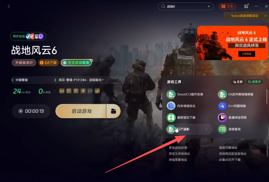 想要进行刷枪操作首先得借助奇游加速工具。在奇游中搜索战地6,进行一键加速处理。加速完成后点击右侧提供的门户速刷链接。