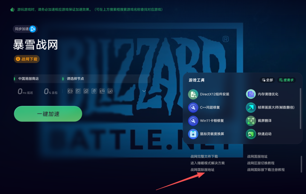 首先准备一款奇游加速工具在搜索栏输入COD21后选择亚服节点进行一键加速。完成加速后,通过奇游内置的官网入口进入战网国际版页面。