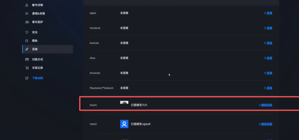 在账号设定页面中,找到平台关联功能,将我们的Steam平台与战网账号进行关联。