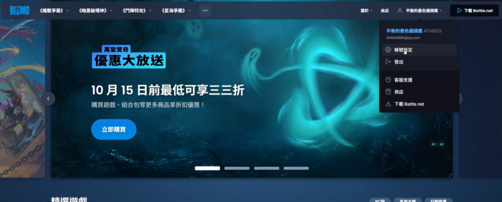 完成账户创建后再次返回战网官网首页,使用新注册的账号进行登录。登录成功后,点击右上角的头像图标,选择账号设定选项。
