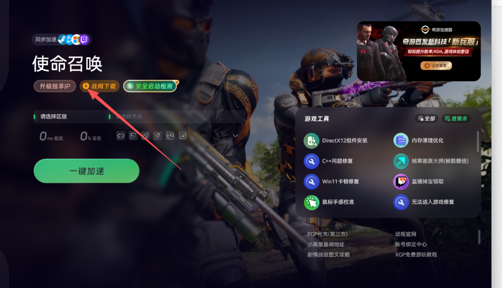 首先要借助奇游加速工具来优化网络连接。在奇游搜索框中输入使命召唤点进行一键加速。