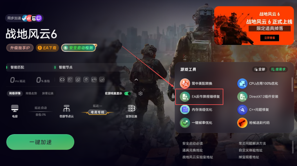在打开《战地风云6》过程中,打开奇游,搜索”战地风云6″。优化电脑本地网络的环境,从而解决因网络问题导致的战地风云6 战地6卡白条加载反作弊,发生未知错误,directx错误等问题等情况。