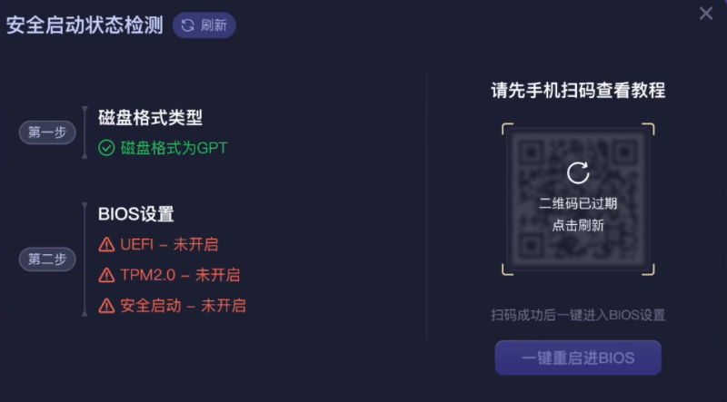 加速成功后,界面右边会有一个“安全启动检测工具”的选项,点它运行。能自动帮你检测磁盘格式、UEFI、TPM 2.0 和安全启动这些设置到底哪里出了问题。