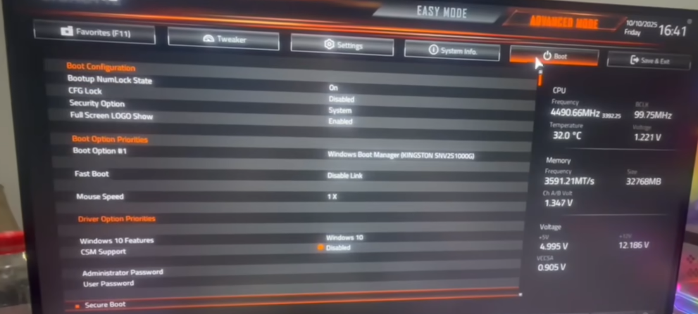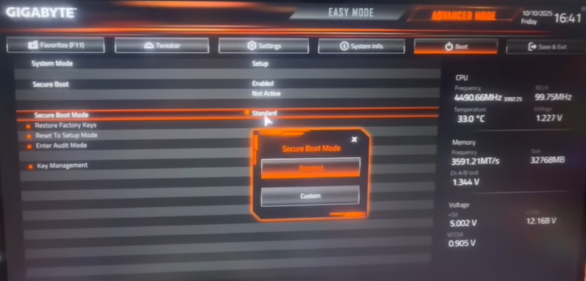 下面以技嘉主板为例,演示具体怎么设置。进入BIOS后,先点击右上角的“Advanced Mode”(高级模式),然后找到并点击“Boot”选项。在Boot菜单最下面,找到“Secure Boot”这一项,双击打开它。