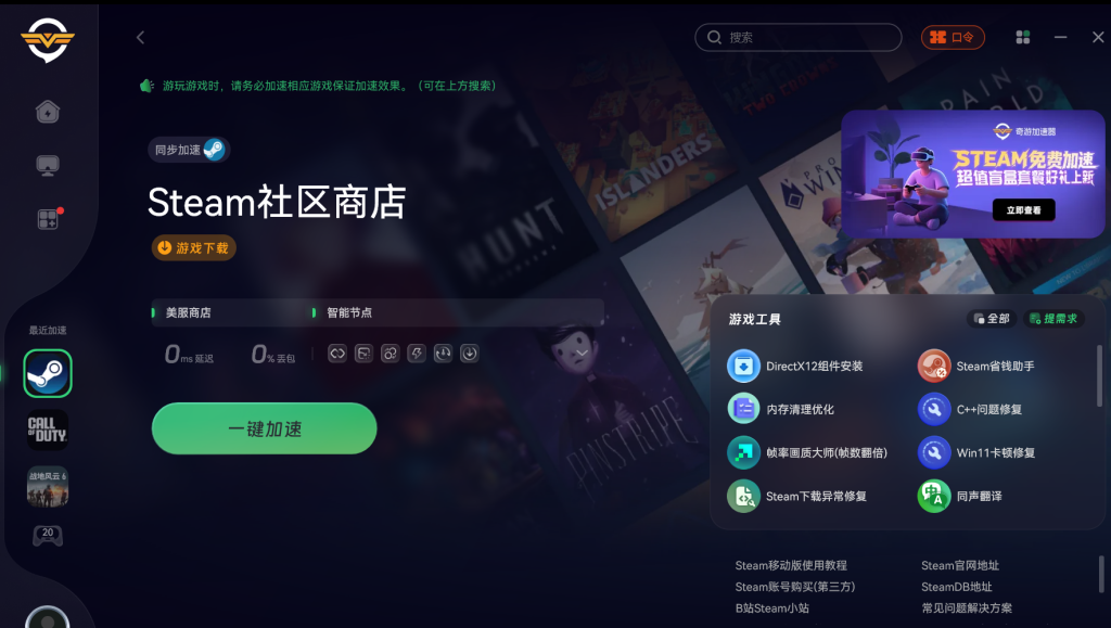 - 打开奇游加速器,搜索 “Steam” 并选择合适节点进行一键加速,为后续安装操作提供稳定网络环境。
