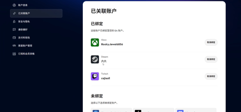 点击Steam头像进入个人档案页面,在相关设置中找到账号关联选项,将自己的Steam账号与EA账号进行关联。这样在Steam上也能正常使用领取到的奖励。
