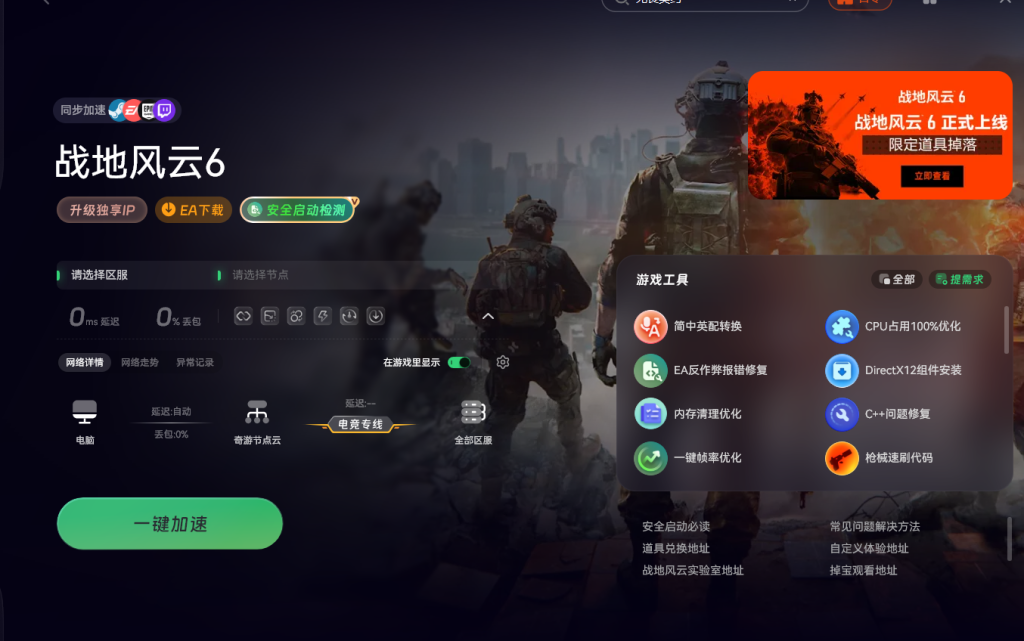 为了确保后续操作的流畅性,小编建议玩家们使用奇游加速工具。在奇游加速工具的右上角口令输入框输入战地6,可以获得最高720小时的加速时长,还能获取四个奖励的CDK。