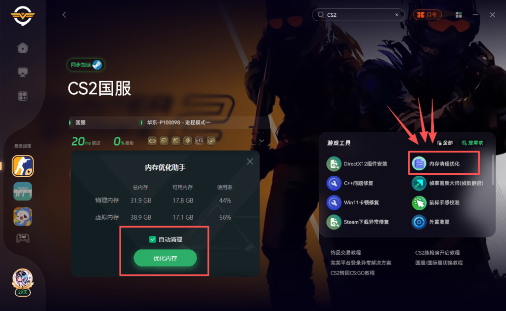 最后我们还需要清理一下内存,奇游支持一键清理,打开奇游加速《CS2》点击右侧的内存清理优化,并勾选自动清理点击优化内存,即可一键清理内存。