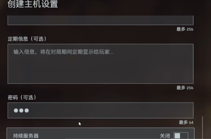 关闭”持续服务器”选项以防止异常掉线,密码栏留空或输入房主设定密码完成上述配置后点击”主持”按钮,系统将自动跳转至专属配件刷取服务器。