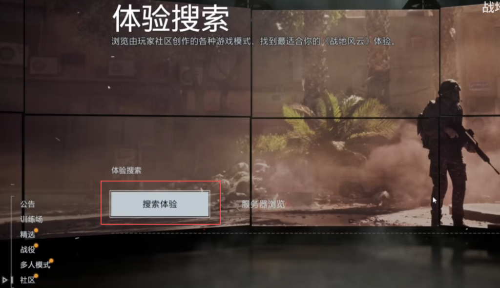 进入战地6主界面后,通过”社区-搜索体验”路径进入服务器筛选界面。