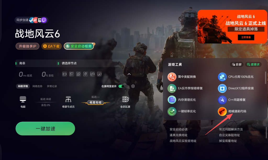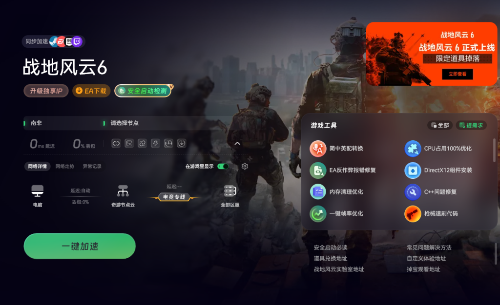 通过奇游加速工具搜索战地6服务器节点,优先选择南非线路。可以有效避免因服务器识别失败导致的连接中断问题。