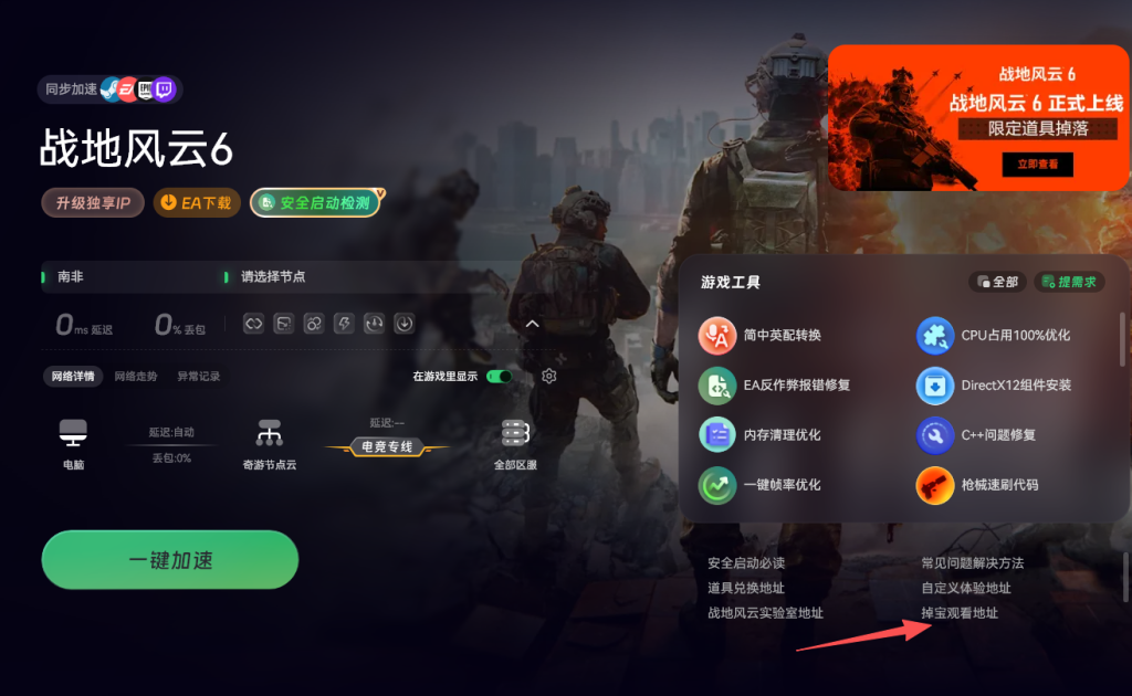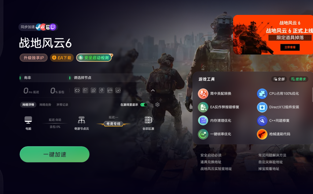 首先要借助奇游加速工具,打开奇游搜索战地6进行加速。同时对老鼠台和战地6进行网络优化,让我们在操作过程中无需来回切换网络设置,十分便捷。