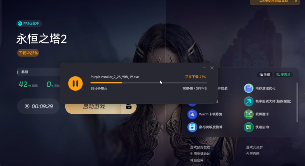 完成加速后点击游戏下载按钮,通过一键下载功能获取purple客户端。下载并安装好客户端后,打开它,在界面右上角找到相关选项。