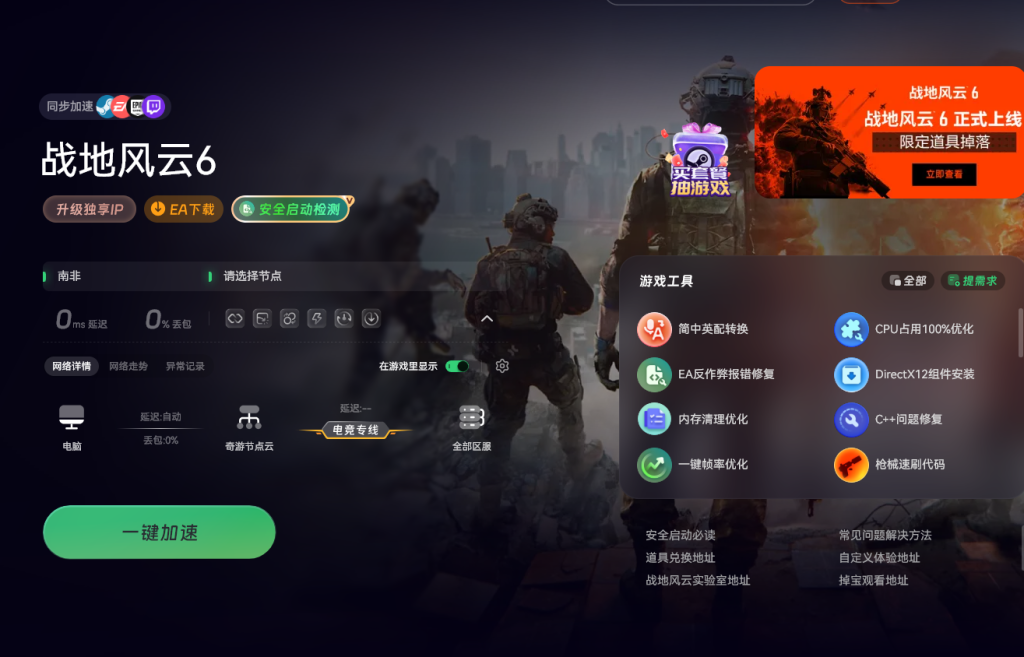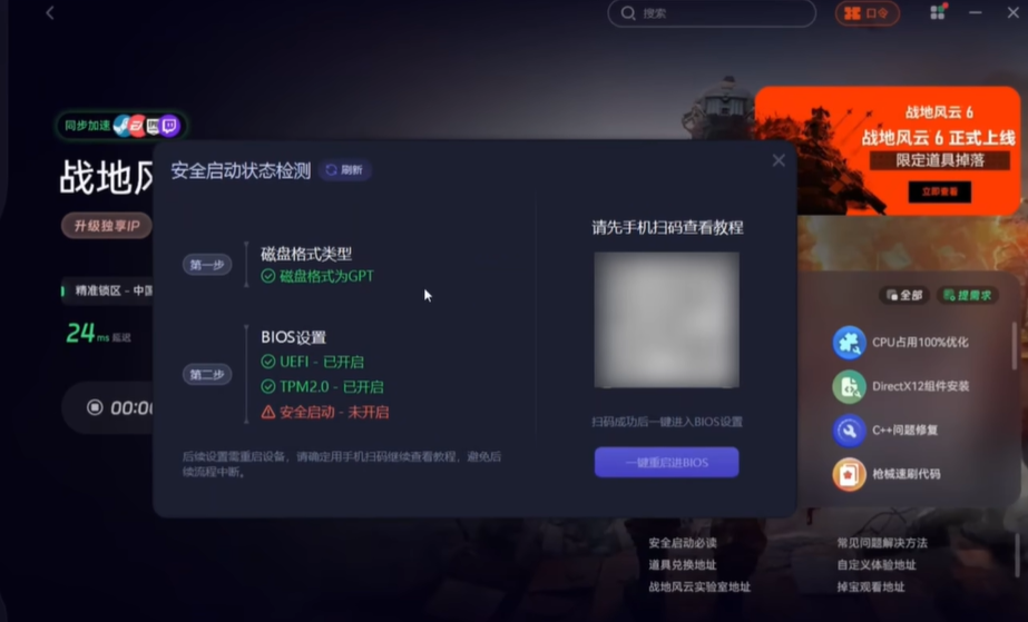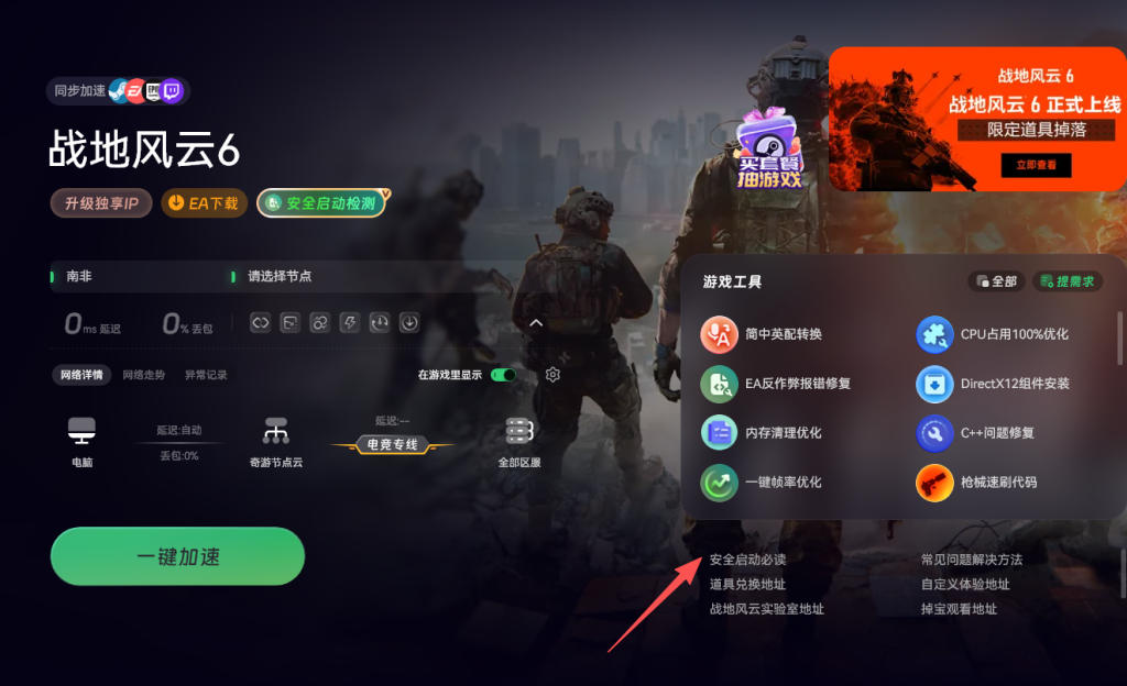 部分玩家在进入游戏时,可能会遇到因未启用Secure Boot而导致的报错提示。针对这一问题,玩家可以使用奇游加速工具来优化游戏连接,随后点击安全启动检测功能。