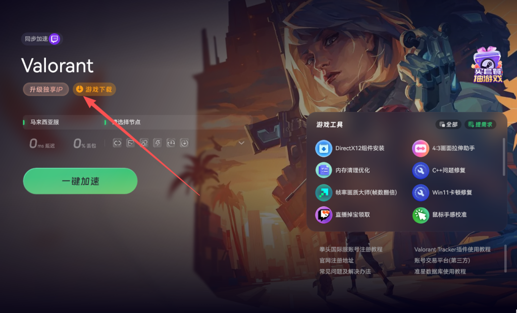 首先要准备好奇游加速工具。打开奇游瓦罗兰特,从搜索结果中选择港服进行加速。加速过程需要一些时间,待加速完成后,点击页面上方的“游戏下载”按钮。