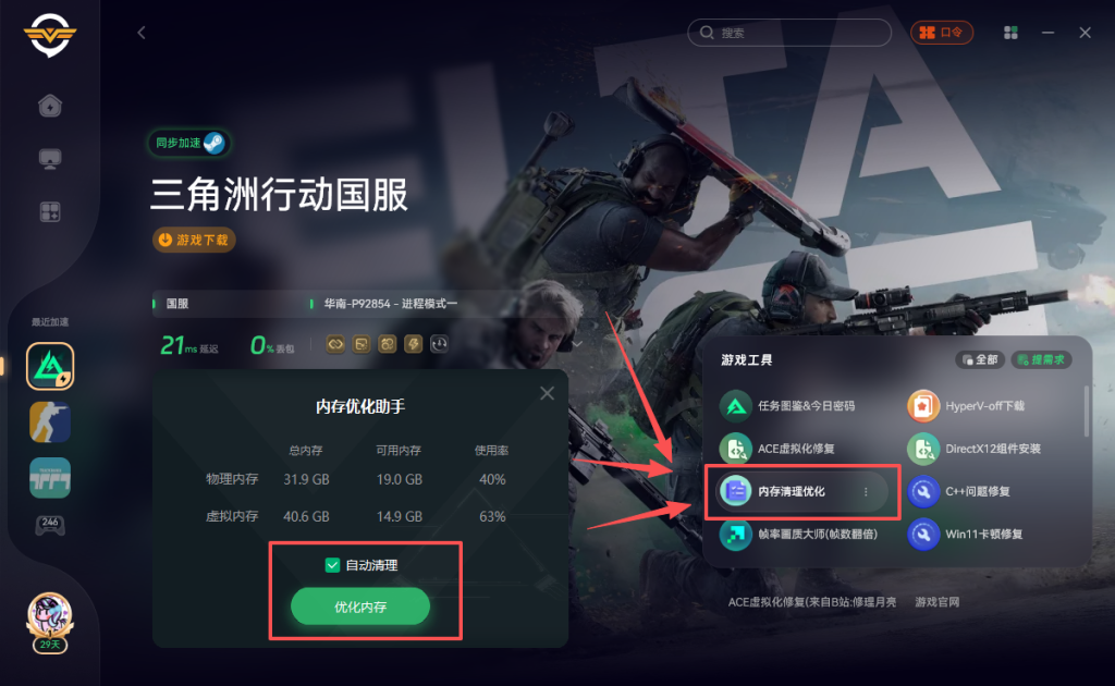 崩溃闪退主要是内存导致的,奇游支持一键清理,打开奇游,加速《三角洲行动》点击右侧的内存清理优化,并勾选自动清理点击优化内存,即可一键清理内存。