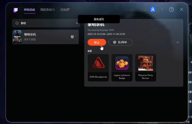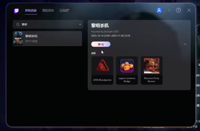 登录成功之后,在页面右上角找到你的头像,点开下拉菜单,里面有个“掉宝与奖励”的选项。点进去之后,再找到“所有活动”,在里面选择《黎明杀机》万圣节这个活动,点击“参与”就可以了。