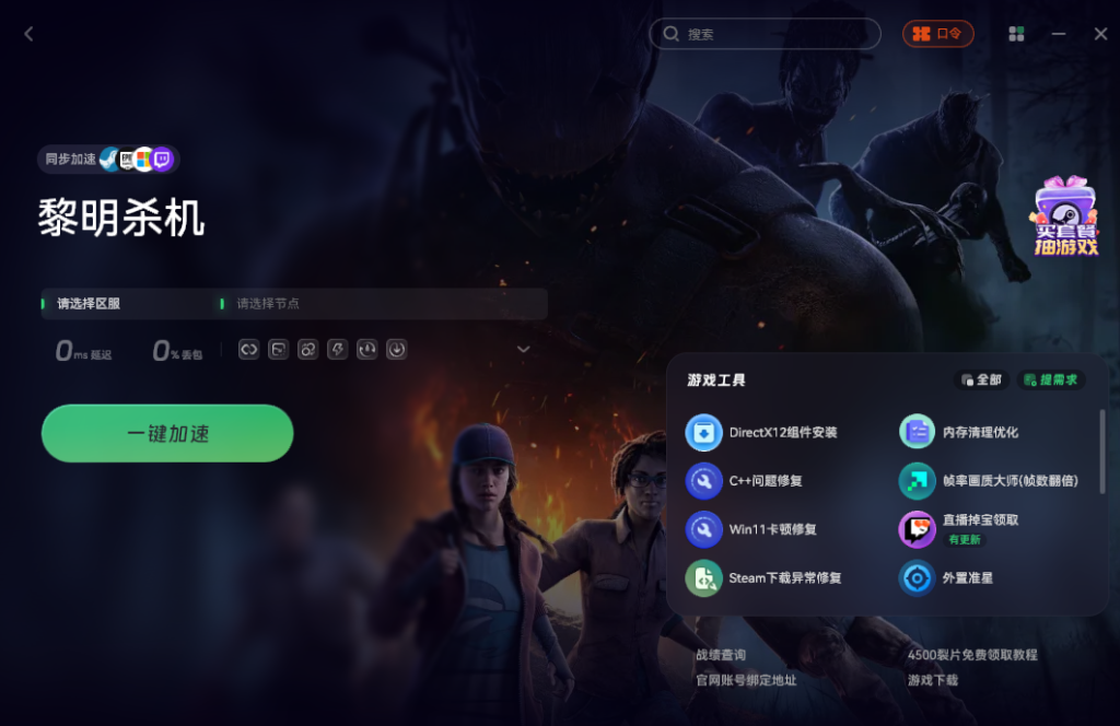 首先,你需要打开Twitch的官网。不过这个网站直接访问有时候打不开,这里可以先用一下奇游加速工具。在加速工具里搜索“黎明杀机”进行加速就行。加速之后,再访问Twitch网站就正常了。