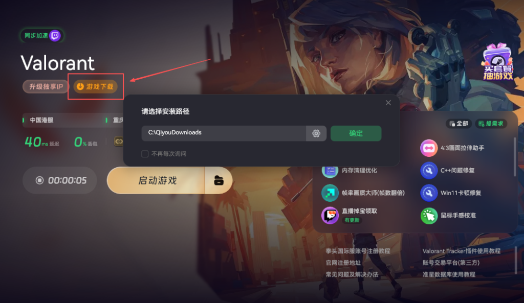 账号搞定后,回到加速界面。通常这里会有一个很显眼的“一键下载”按钮,点击它就能开始下载《瓦罗兰特》的港服游戏客户端。