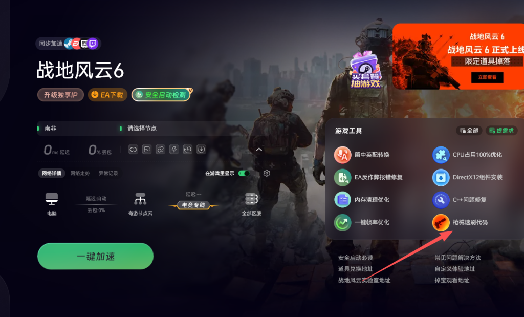 首先需要借助奇游加速工具来应对这一挑战,打开奇游加速工具后,在搜索框中输入战地六,选择南非节点进行一键加速。完成加速后,通常即可解决因服务器超出配额而无法进入游戏的问题。