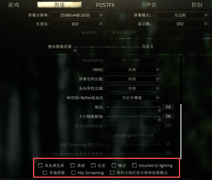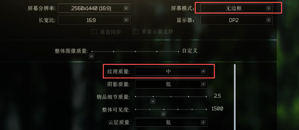 然后图像设置,建议无边框帧数高点,最关键的纹理质量,8g显存以下低,8-12g中,16g以上高,这个非常关键