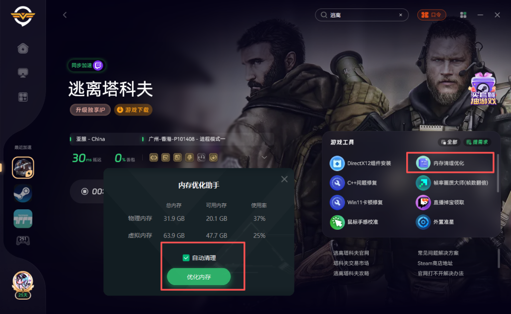 这个一般是我们的内存爆了,我们可以清理一下内存,奇游支持一键清理,打开奇游,加速《逃离塔科夫》点击右侧的内存清理优化,并勾选自动清理点击优化内存,可以一键清理内存。