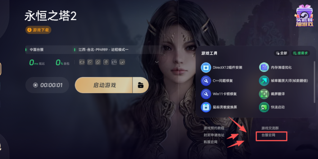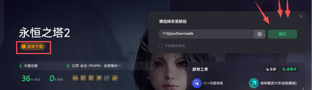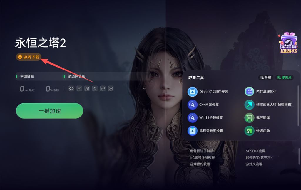 咱们以台服作为示例使用奇游加速工具能实现一键下载。先打开奇游对永恒之塔2进行加速,接着点击橙色的游戏下载按钮,就能一键下载启动器。