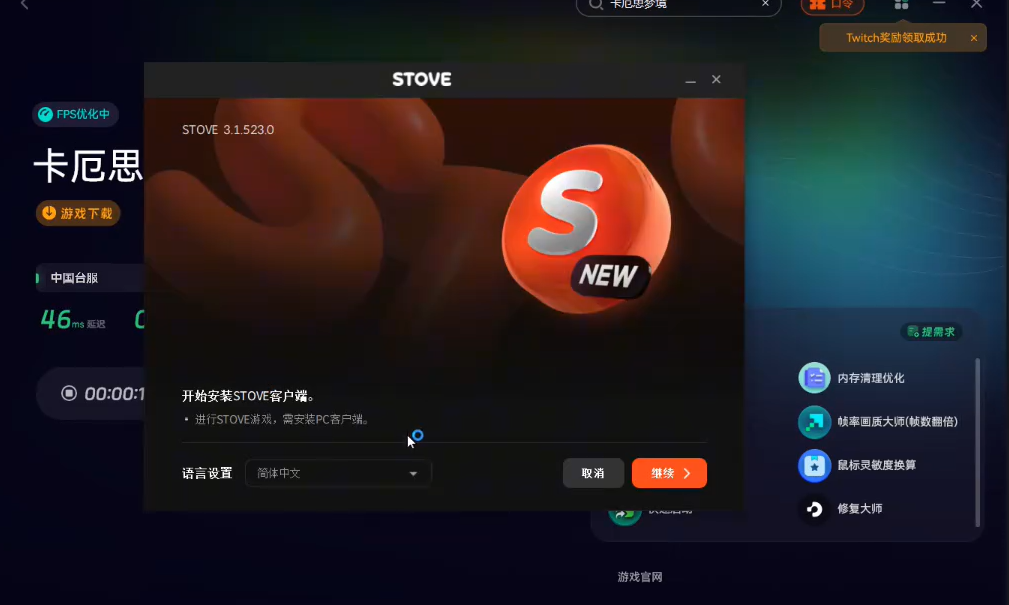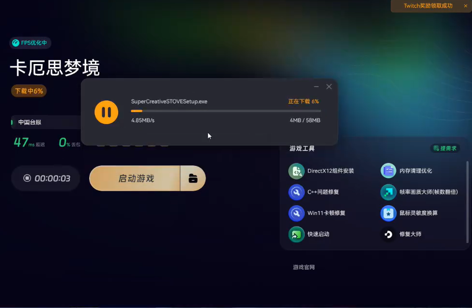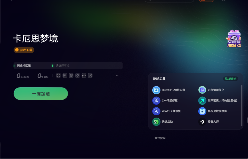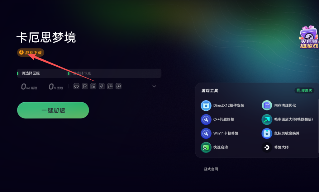 打开奇游加速工具后,在搜索栏输入“卡厄思梦境”点击一键加速到游戏,接着选择你想要游玩的区服。完成加速和区服选择后,在游戏名下方就能看到下载按钮,点击该按钮即可直接下载官方客户端。