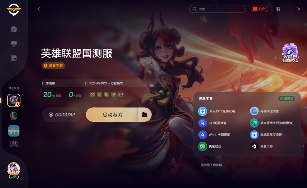 奇游支持一键下载,打开奇游,加速《英雄联盟国测服》点击橙色的游戏下载