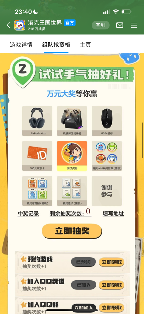 下滑第二页点击立即抽取登入你的账号每天也可以抽取测试资格。每天零点刷新抽奖机会