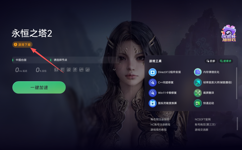 首先为了在预约抢占环节占据优势,建议使用奇游加速工具对永恒之塔2进行加速。加速完成后,点击链接一键下载游戏客户端。