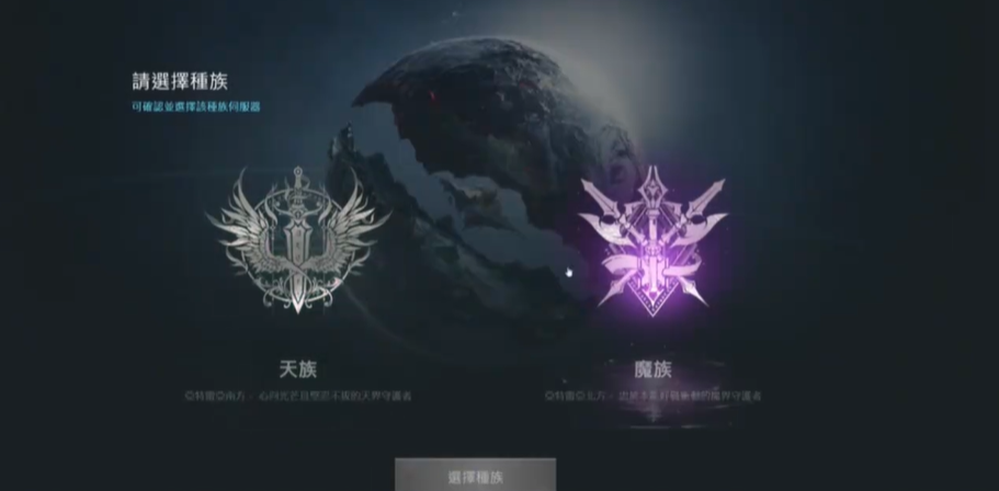 注册并登录账号后,进入角色创建环节。选择你心仪的游玩种族,点击确定。接着挑选天使种族的服务器。