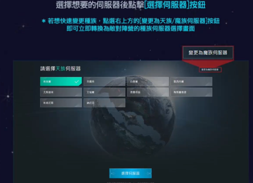 选定种族后接着选择服务器。要是之后想更换种族或服务器,可在右上角找到切换服务器的选项。