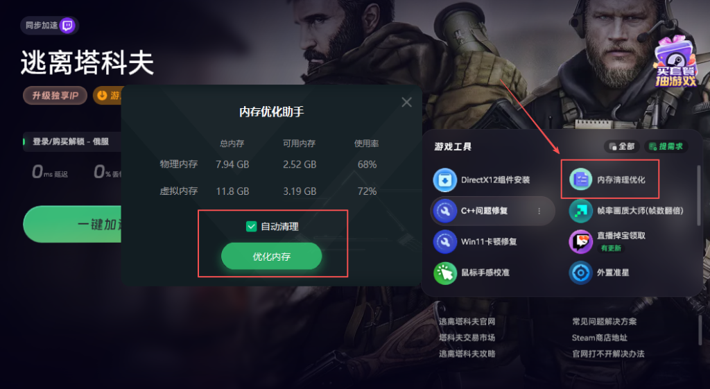 奇游加速工具还具备一键清理功能,该功能能够自动清理系统中的冗余文件与缓存,释放磁盘空间,优化系统性能。打开奇游加速逃离塔科夫游戏,一键清理功能,可有效改善游戏运行环境,减少因系统资源占用过高而导致的加载地图卡死、加载时间过长等问题。