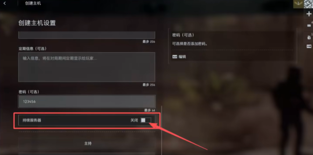 接下来,点击“主持”按钮,创建一个房间。这里记得随便设个密码,同时留意把“持续服务器”这个选项关掉,不然可能会影响正常进入。