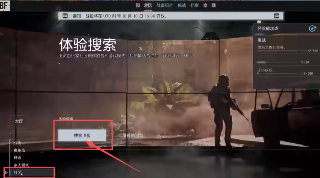 拿到代码之后,打开《战地6》进入游戏,在主菜单找到“社区”栏目,点里面的“搜索体验”。
