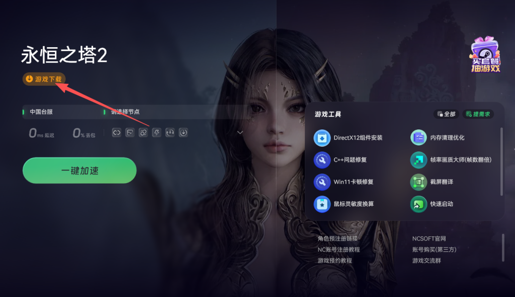首先为确保游戏下载及后续登录过程顺利,使用使用奇游加速工具对永恒之塔2台服进行加速处理。加速完成后,点击游戏下载选项,即可开启客户端的下载流程。