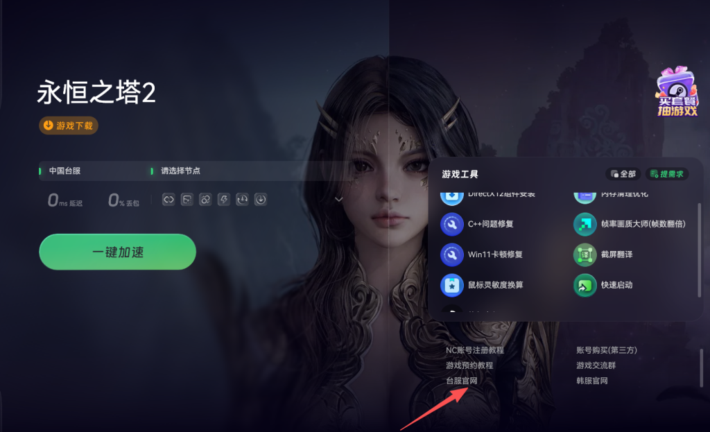 首先启动奇游加速工具,在搜索栏输入永恒之塔2,点击一键加速。加速完成后,点击旁边的台服官网链接进入官网页面。
