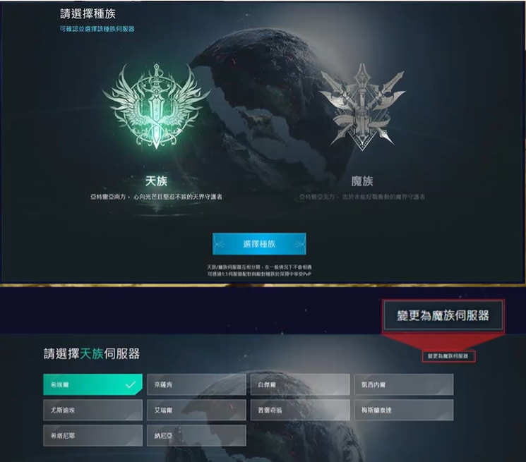 登录PLAYNC账号后,玩家需要从天族和魔族中挑选出自己喜爱的种族。接着,仔细浏览服务器列表,确定自己想要进入的目标服务器,然后进入抢占界面。