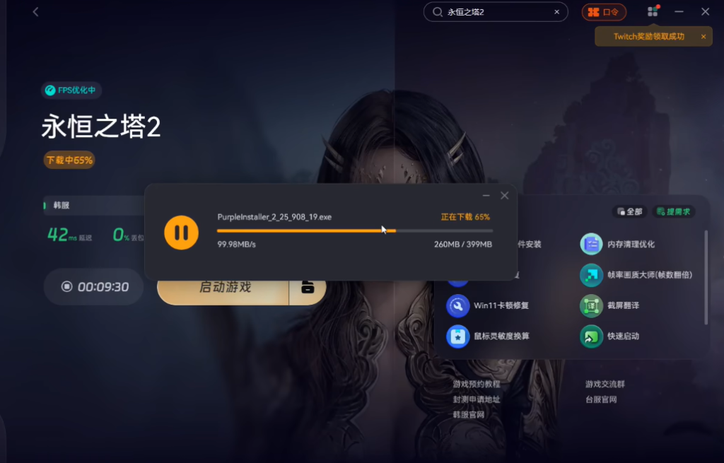 为了确保在登录台服时不会遇到登录失败、purple平台无法打开或者闪退等问题,首先要使用奇游加速工具对永恒之塔2台服进行加速处理。加速完成后,点击游戏下载选项。