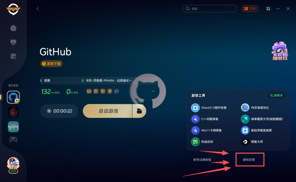 首先我们需要去GitHub下载工具,为了流畅访问GitHub官网,可以使用奇游,加速一下《GitHub》点击右侧的游戏官网,可直达GitHub。