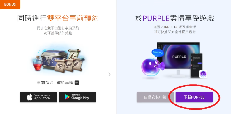 再回到“事前预约”页面,往下拉,右下角有个紫色按钮,那是游戏平台客户端,类似WEGAME,以后玩游戏必须用它,可以提前下载好。