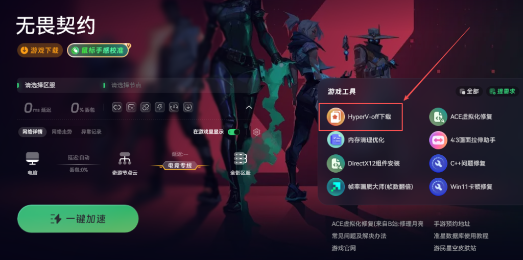 奇游加速工具里有个Hyperv组功能,可以帮助我们解决CPU虚拟化报错、ACE弹窗、CPU虚拟化未启用以及闪退等问题。只需打开奇游加速工具点击Hyperv下载就能让游戏恢复正常运行。