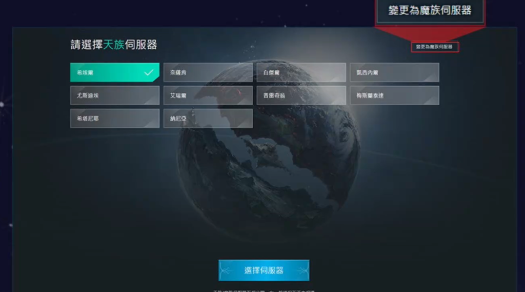 登录账号后,点击开始抢占按钮,会弹出种族选择界面。玩家可以根据自己的喜好,从“天族”和“魔族”中任选其一。选定种族后,进入服务器列表。