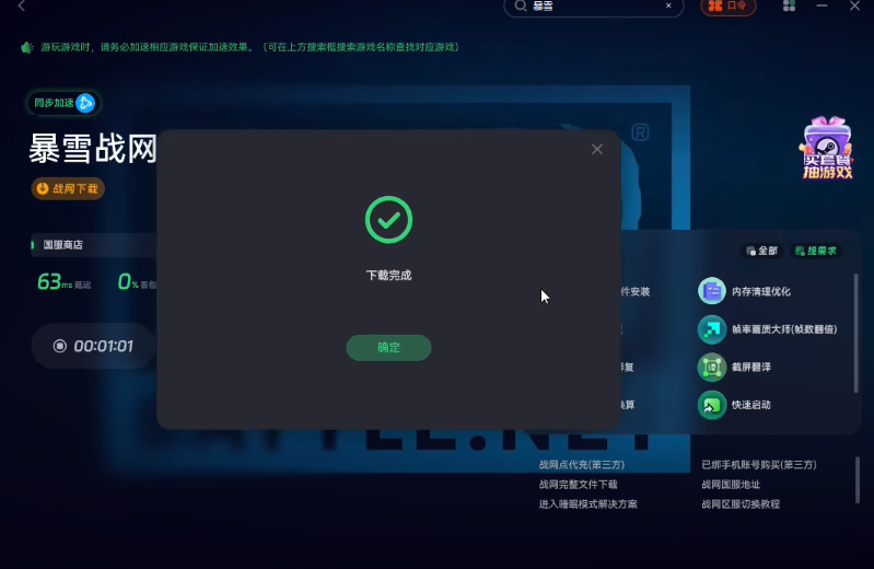 加速完成后点击左侧的战网下载按钮,客户端会自动完成解压与安装。安装完毕启动暴雪客户端时,务必检查一下区服设置,确保选择的是国服。