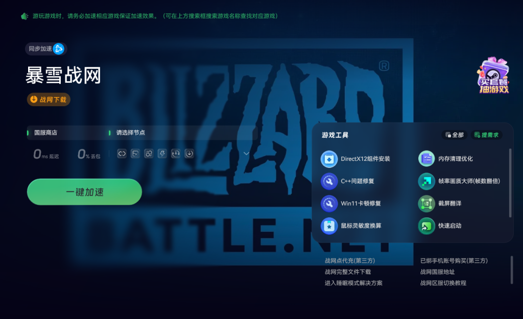 首先准备一个奇游加速工具,在工具中搜索暴雪战网,进入相关页面后,就能下载到最新版的暴雪客户端,同时还能进行智能加速,优化网络环境。