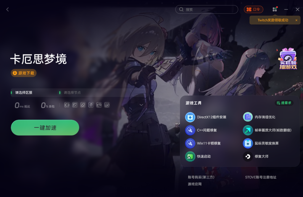 首先,打开奇游加速工具,直接搜索“卡洛斯梦境”,选个好用的节点,点一键加速。